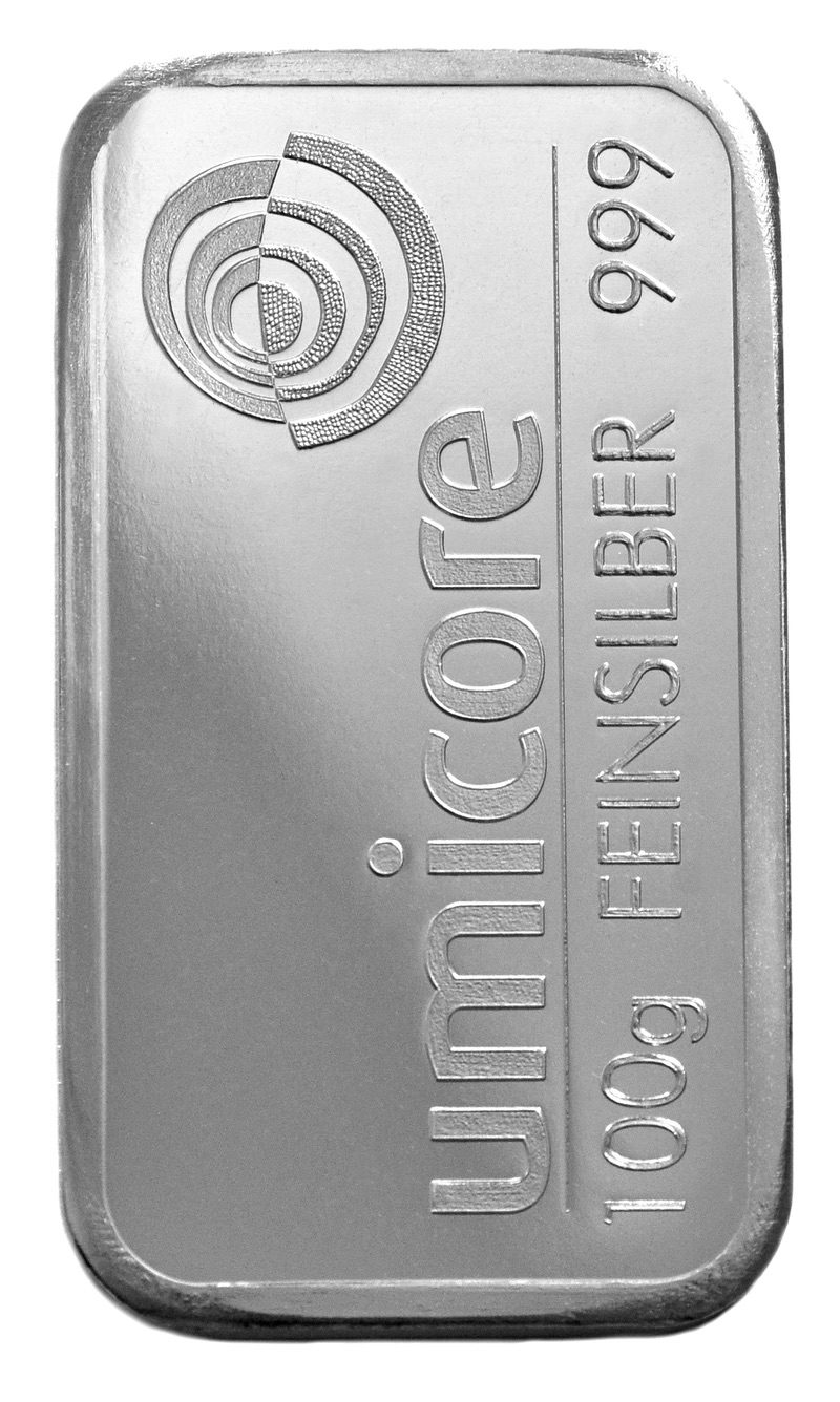 A brand-new 100 gram silver bar, manufactured by LBMA-approved refiner Umicore. These Umicore 100g silver bars are minted with a clean finish, and are produced to 999 purity.
