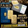 The 2.5 gram gold bar is made by PAMP, a well known producer of Swiss gold bars based in the canton of Ticino.