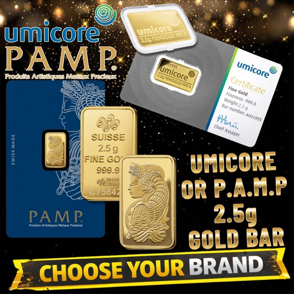 A brand-new 2.5 gram fine gold bar, supplied by LBMA-approved refiner Umicore.