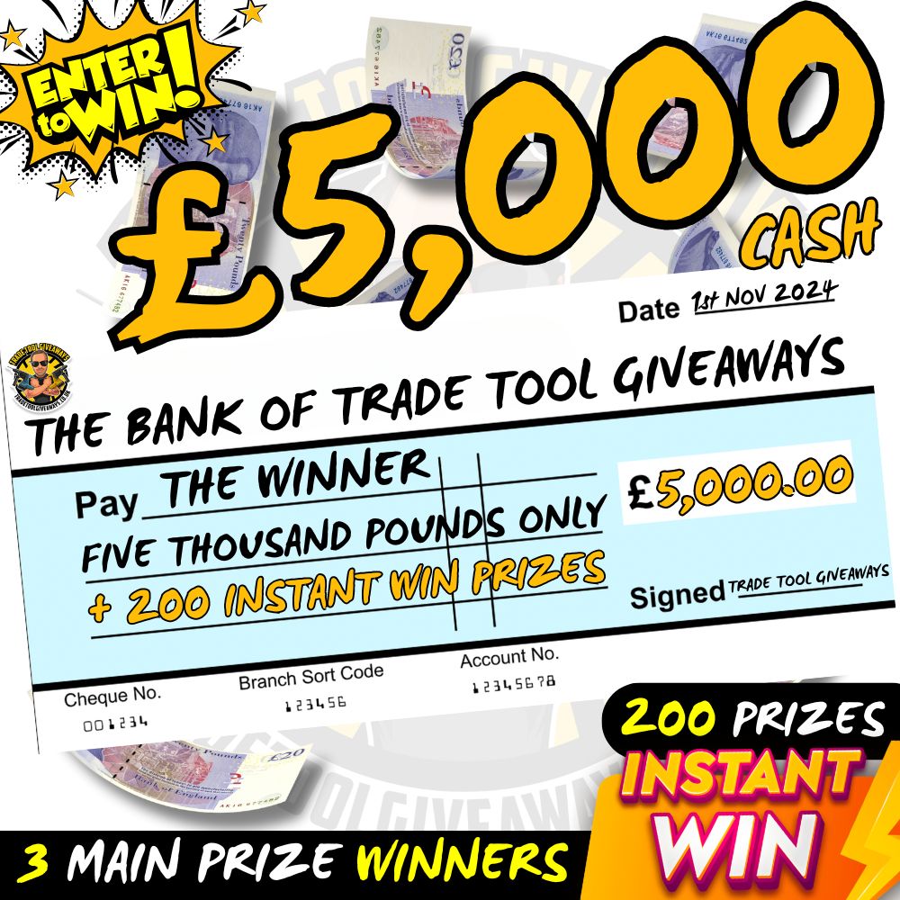 This competition is open to UK residents aged 18 or over. You may enter this competition up to 400 times. You will be randomly allocated ticket number(s) when ordering and will receive an email confirmation. The total amount of tickets for this competition is (5000). If all tickets do not sell out, the draw will happen on October 28, 2024 regardless. You must answer the competition question correctly to be entered into the live draw. Incorrect entries will not be notified or entered into the live draw. You may enter the competition online, or for free by post by sending your entry to Trade Tool Giveaways on a postcard. You must have an account on Trade Tool Giveaways for your entry to be processed. All details on your entry MUST correspond to the details on your account to receive the order confirmation and ticket number. Postal entries received without a registered account cannot be processed. The live draw will take place on Trade Tool Giveaways Facebook page using Google’s random number generator to select the winning ticket number from all Entrants. This competition is in no way sponsored, endorsed, administered by or associated with Facebook, Apple or Google. By entering the competitions, Entrants agree that neither Facebook, Apple nor Google have any liability and are not responsible for the administration or promotion of this competition.