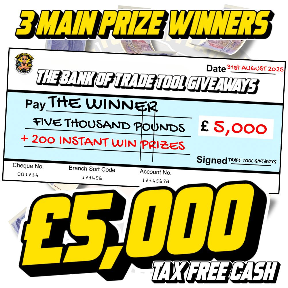 This competition is open to UK residents aged 18 or over. You may enter this competition up to 500 times. You will be randomly allocated ticket number(s) when ordering and will receive an email confirmation. The total amount of tickets for this competition is (5000). If all tickets do not sell out, the draw will happen on August 31, 2025 regardless. You must answer the competition question correctly to be entered into the live draw. Incorrect entries will not be notified or entered into the live draw. You may enter the competition online, or for free by post by sending your entry to Trade Tool Giveaways on a postcard. You must have an account on Trade Tool Giveaways for your entry to be processed. All details on your entry MUST correspond to the details on your account to receive the order confirmation and ticket number. Postal entries received without a registered account cannot be processed. The live draw will take place on Trade Tool Giveaways Facebook page using Google’s random number generator to select the winning ticket number from all Entrants. This competition is in no way sponsored, endorsed, administered by or associated with Facebook, Apple or Google. By entering the competitions, Entrants agree that neither Facebook, Apple nor Google have any liability and are not responsible for the administration or promotion of this competition.