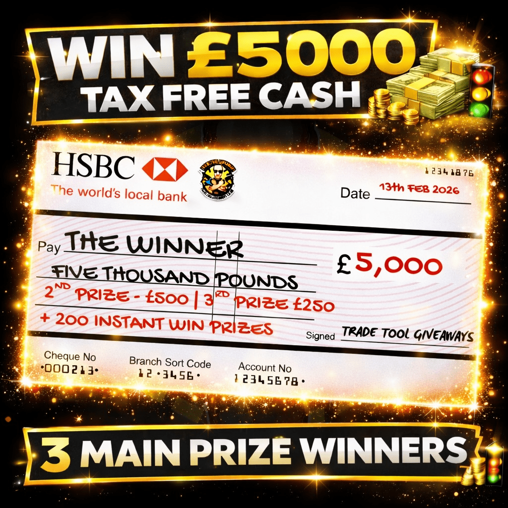 This competition is open to UK residents aged 18 or over. You may enter this competition up to 500 times. You will be randomly allocated ticket number(s) when ordering and will receive an email confirmation. The total amount of tickets for this competition is (5000). If all tickets do not sell out, the draw will happen on February 13, 2026 regardless. You must answer the competition question correctly to be entered into the live draw. Incorrect entries will not be notified or entered into the live draw. You may enter the competition online, or for free by post by sending your entry to Trade Tool Giveaways on a postcard. You must have an account on Trade Tool Giveaways for your entry to be processed. All details on your entry MUST correspond to the details on your account to receive the order confirmation and ticket number. Postal entries received without a registered account cannot be processed. The live draw will take place on Trade Tool Giveaways Facebook page using Google’s random number generator to select the winning ticket number from all Entrants. This competition is in no way sponsored, endorsed, administered by or associated with Facebook, Apple or Google. By entering the competitions, Entrants agree that neither Facebook, Apple nor Google have any liability and are not responsible for the administration or promotion of this competition.