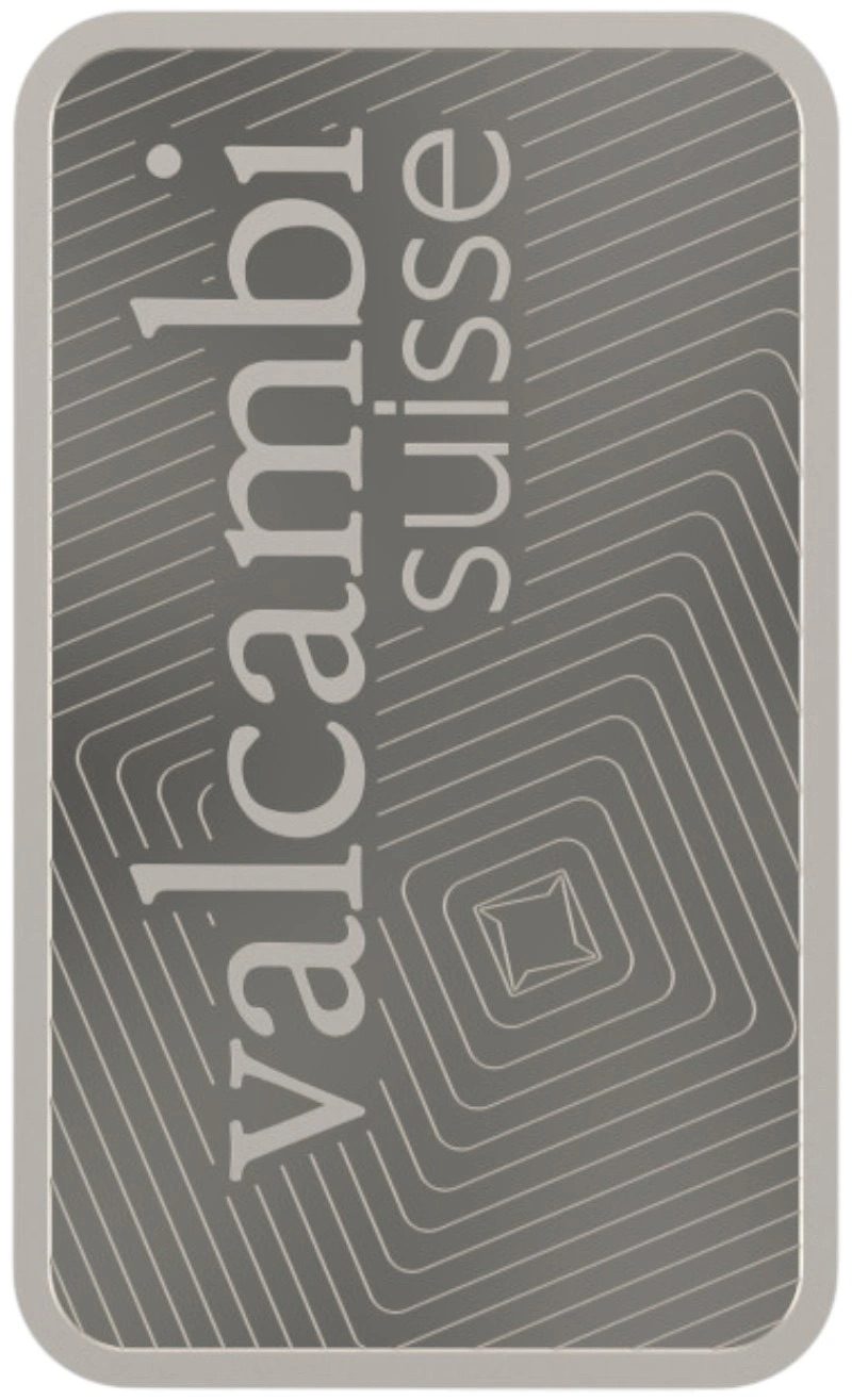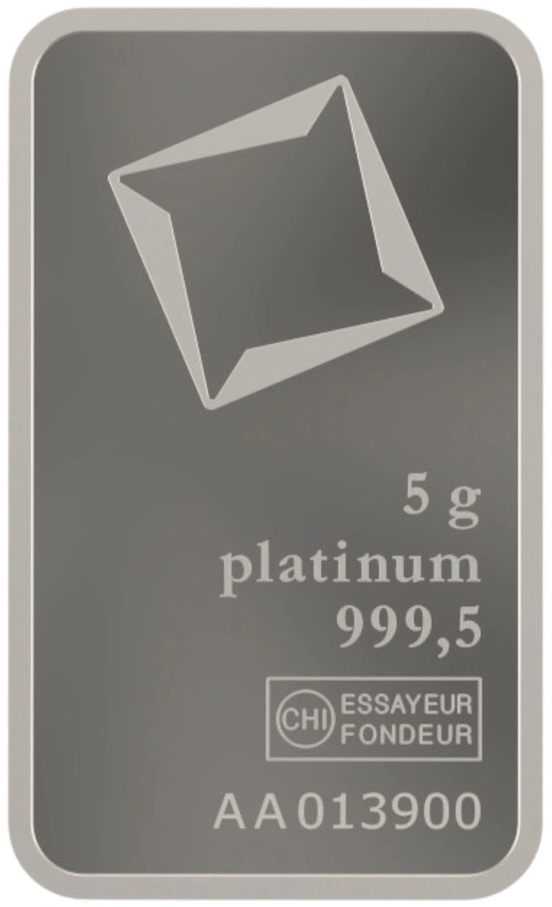 A brand-new 5g platinum bar made by leading Swiss refiners Valcambi. This very attractive bar has a purity of 999.5 and contains exactly five grams of platinum.