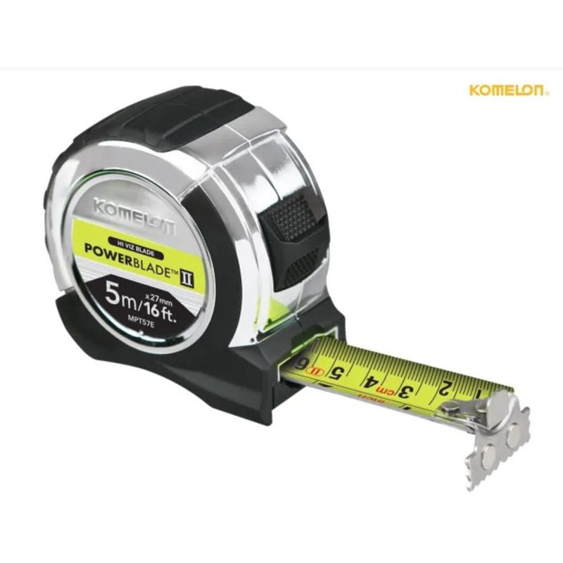 The Komelon 5m / 16ft PowerBlade Tape has a dura NY nylon coated steel dual printed blade with vertical blade markings on the reverse and patented hi-vis blade printing. The Dura NY nylon coating offers superior quality that lasts up to 15 times longer.