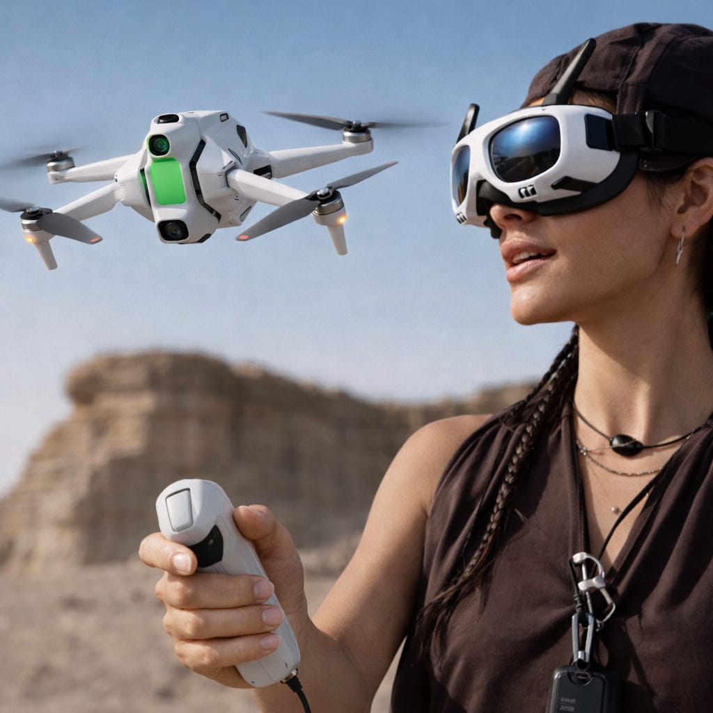 Antigravity A1, powered by Insta360, is the world’s first drone with built-in 8K 360-degree capture. Weighing just 249g, it often avoids registration requirements & is travel-friendly. A dual-lens system creates an “invisible drone” effect, removing the propellers from footage. Pilots use Vision goggles for an immersive live 360-degree view with head tracking and a single-handed Grip motion controller. This “fly first, frame later” workflow allows users to choose the best angles in editing.