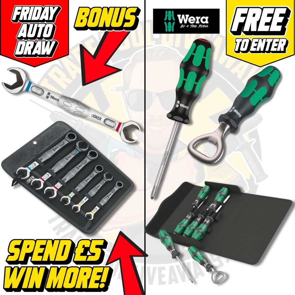 This competition is open to UK residents aged 18 or over. You may enter this competition up to 10 times. You will be randomly allocated ticket number(s) when ordering and will receive an email confirmation. The total amount of tickets for this competition is (5000). If all tickets do not sell out, the draw will happen on June 27, 2025 regardless. You must answer the competition question correctly to be entered into the live draw. Incorrect entries will not be notified or entered into the live draw. You may enter the competition online, or for free by post by sending your entry to Trade Tool Giveaways on a postcard. You must have an account on Trade Tool Giveaways for your entry to be processed. All details on your entry MUST correspond to the details on your account to receive the order confirmation and ticket number. Postal entries received without a registered account cannot be processed. The live draw will take place on Trade Tool Giveaways Facebook page using Google’s random number generator to select the winning ticket number from all Entrants. This competition is in no way sponsored, endorsed, administered by or associated with Facebook, Apple or Google. By entering the competitions, Entrants agree that neither Facebook, Apple nor Google have any liability and are not responsible for the administration or promotion of this competition.