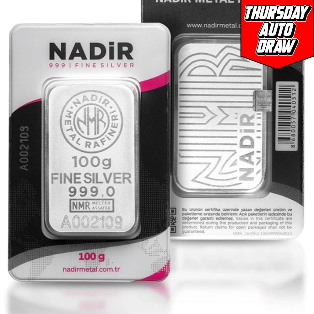 The front of the Nadir 100g silver bar is embossed with a stylised ‘NMR’ encircled by the refinery name ‘Nadir Metal Rafineri’. Below this the bar has an imprint of its weight, metal and purity of 999.9 parts per thousand and a unique serial number.