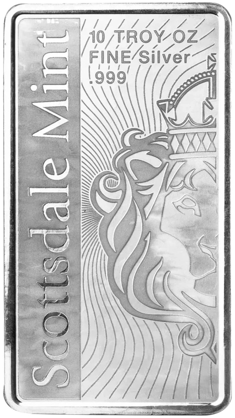 The bar features the famous Scottsdale lion in the centre of a vortex pattern which creates a beautiful play of light to create a unique and eye-catching bar. The reverse displays the Scottsdale Logo, the 10 troy ounces (311g) weight of the bar , and its purity of 999 parts per thousand.