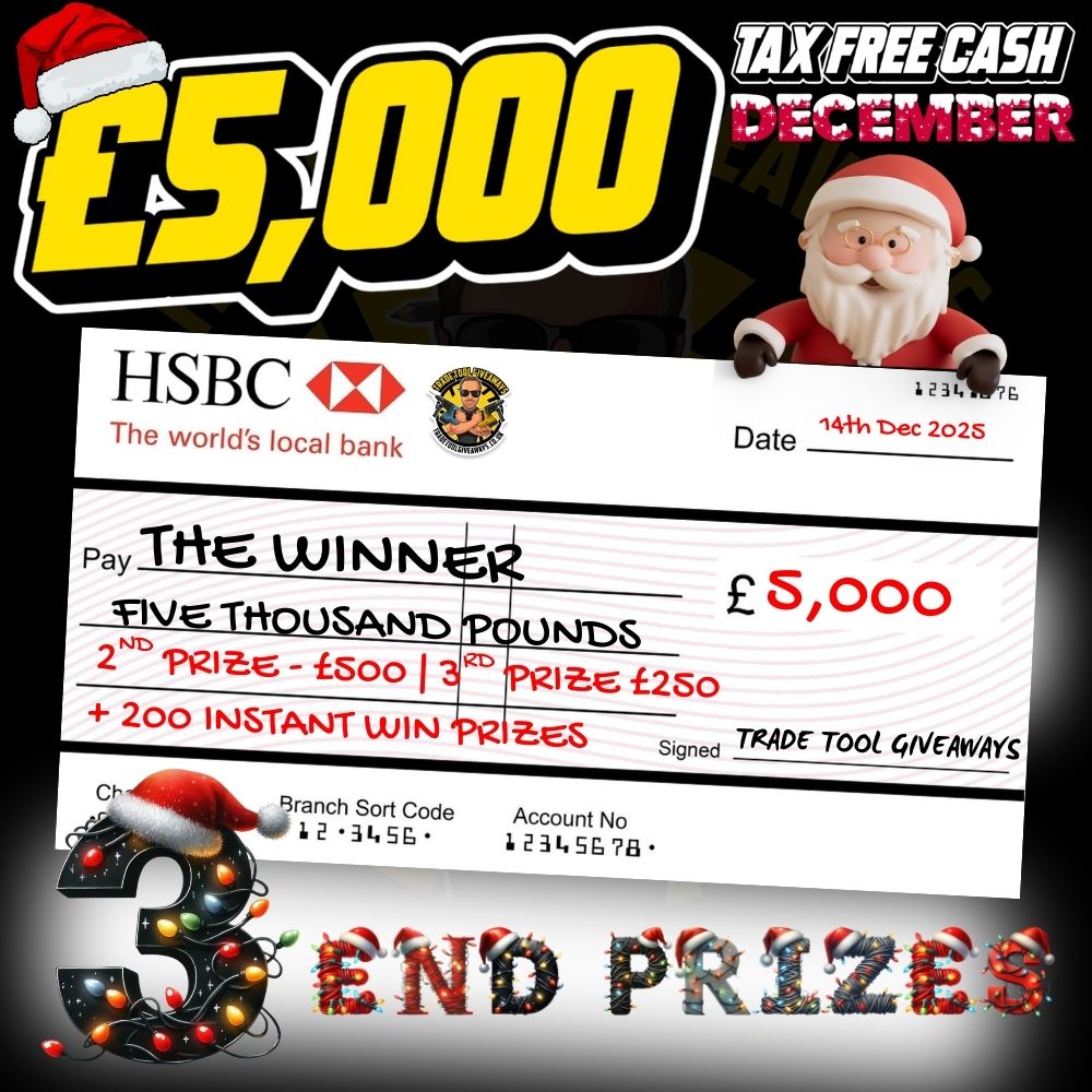 This competition is open to UK residents aged 18 or over. You may enter this competition up to 500 times. You will be randomly allocated ticket number(s) when ordering and will receive an email confirmation. The total amount of tickets for this competition is (5000). If all tickets do not sell out, the draw will happen on December 14, 2025 regardless. You must answer the competition question correctly to be entered into the live draw. Incorrect entries will not be notified or entered into the live draw. You may enter the competition online, or for free by post by sending your entry to Trade Tool Giveaways on a postcard. You must have an account on Trade Tool Giveaways for your entry to be processed. All details on your entry MUST correspond to the details on your account to receive the order confirmation and ticket number. Postal entries received without a registered account cannot be processed. The live draw will take place on Trade Tool Giveaways Facebook page using Google’s random number generator to select the winning ticket number from all Entrants. This competition is in no way sponsored, endorsed, administered by or associated with Facebook, Apple or Google. By entering the competitions, Entrants agree that neither Facebook, Apple nor Google have any liability and are not responsible for the administration or promotion of this competition.