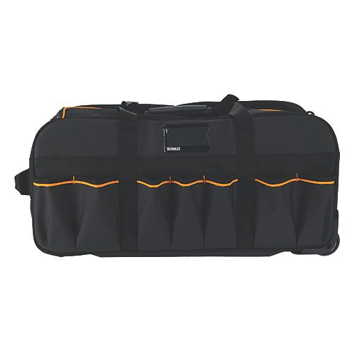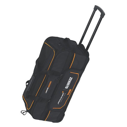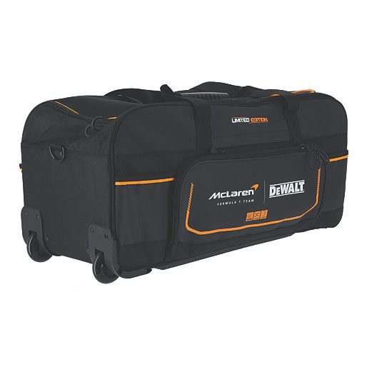 Soft storage solution with large capacity for multiple power tools, hand tools and accessories. Features wide-opening top for easy access to tools, and inner removable divider for efficient tool organization. Extending handle and durable wheels allow equipment to be moved easily in fast-paced, high pressure environments. Also features an ergonomic carry handle and shoulder strap for daily comfort. Made of durable 1680D fabric and dirt-repellant tarpaulin. Part of the DEWALT/McLaren F1 Team range for performance.