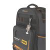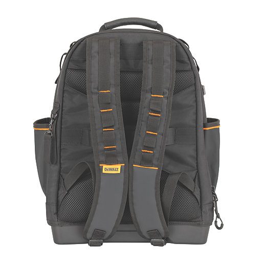 Heavy duty 1680 denier polyester construction, with large open compartment for quick tool access. Features multiple pockets and tool holders for organisation, as well as padded laptop compartment, and IP54 water-resistant welded compartment for personal belongings. Comfortable, ergonomic air mesh padded back and padded shoulder straps. Durable, rigid waterproof plastic base.