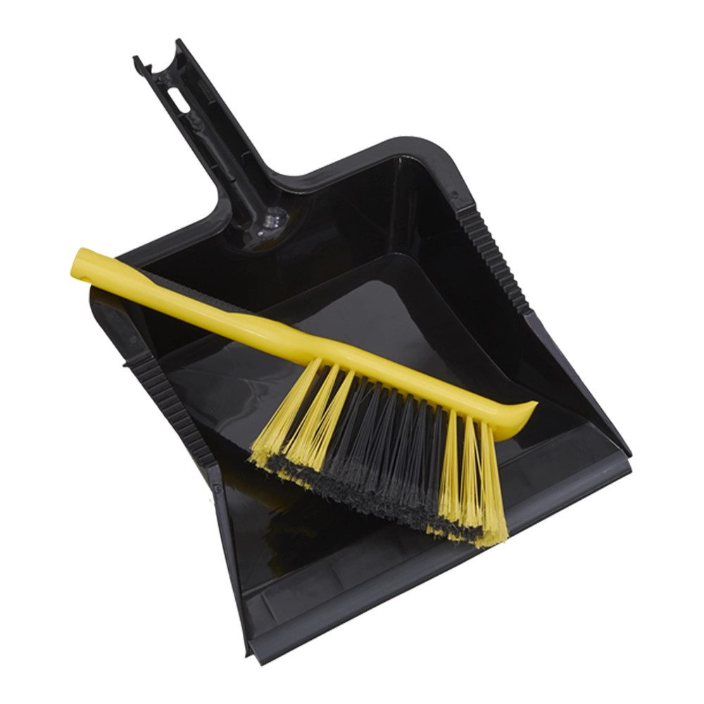 A large, industrial quality pan, with rubber squeegee edge ensures that all debris can be swept in with ease. For convenient storage, the brush can lock securely into the dustpan handle.