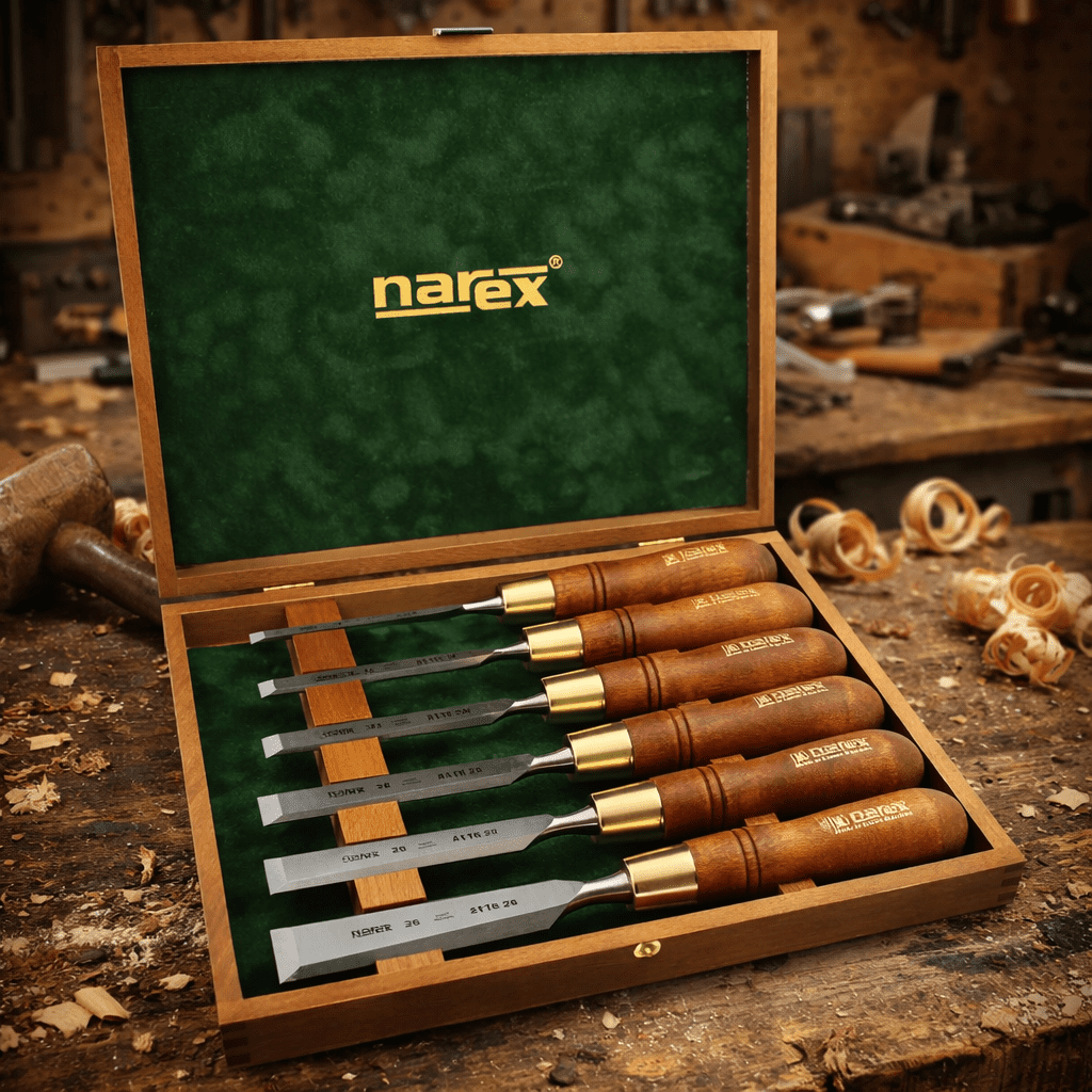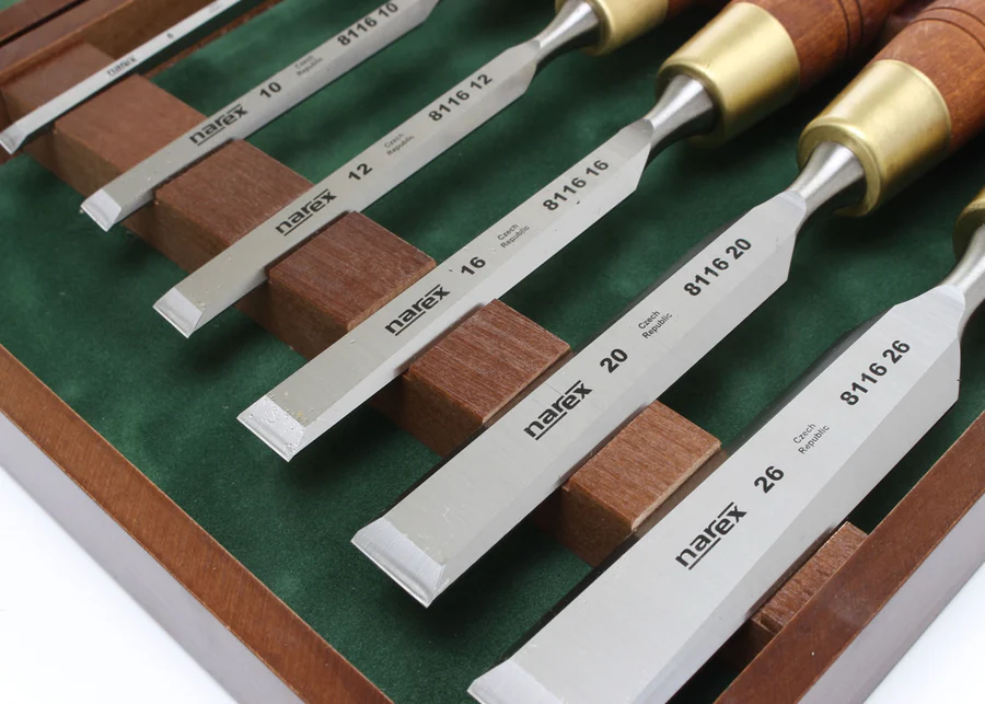 Innovated chisel with improved cross-section of the blade that minimises friction when cutting into wood. Improved grinding of the edges creates expecially thin sides which are in particular needed in dovetailing.