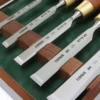 Ergonomic handle from hard and hefty hornbeam wood is strong enough to withstand heavy mallet blows. Combination of the stained hornbeam handle, brass ferrule and improved grinding of the blade creates a unique design of the tool.