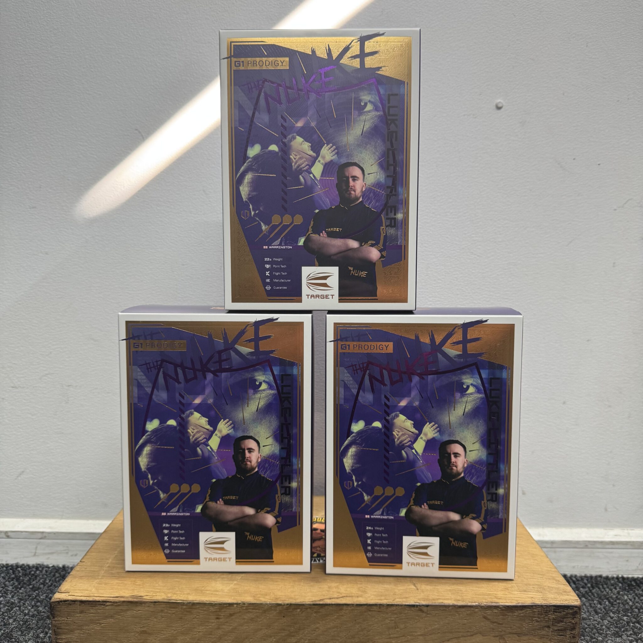 Target Darts Luke Littler Gen 1 Steel Tip Darts Contains: 3 x 90% Tungsten G1 Prodigy Barrels, 3 x 26mm Gold Swiss DX Points, 3 x 30mm Gold Swiss DX Points, 3 x Purple No.2 K-Flex Flights & Shafts, 1 x Premium Gold Swiss Point Keyring Tool, and 1 x Target Tin Storage Box.