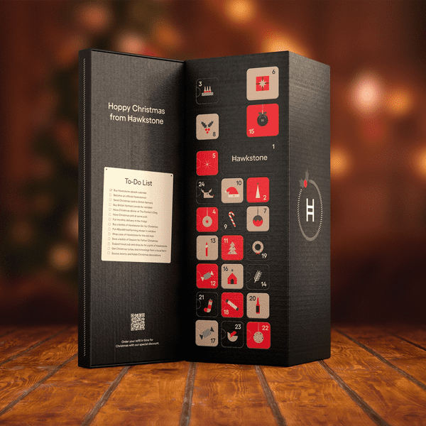 Advent Calendar Includes: assortment of 13x beers, 6x ciders, miniature bottles of our gin and vodka, and exclusive Hawkstone merchandise.