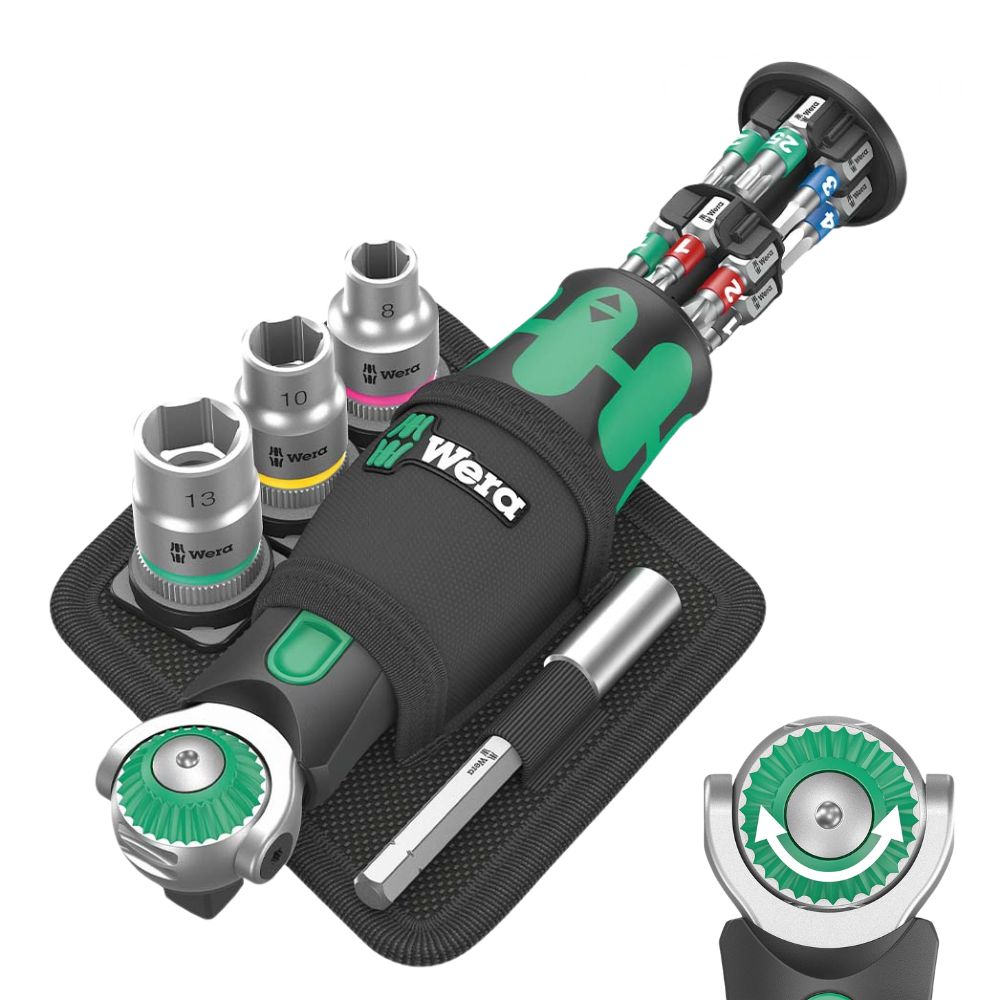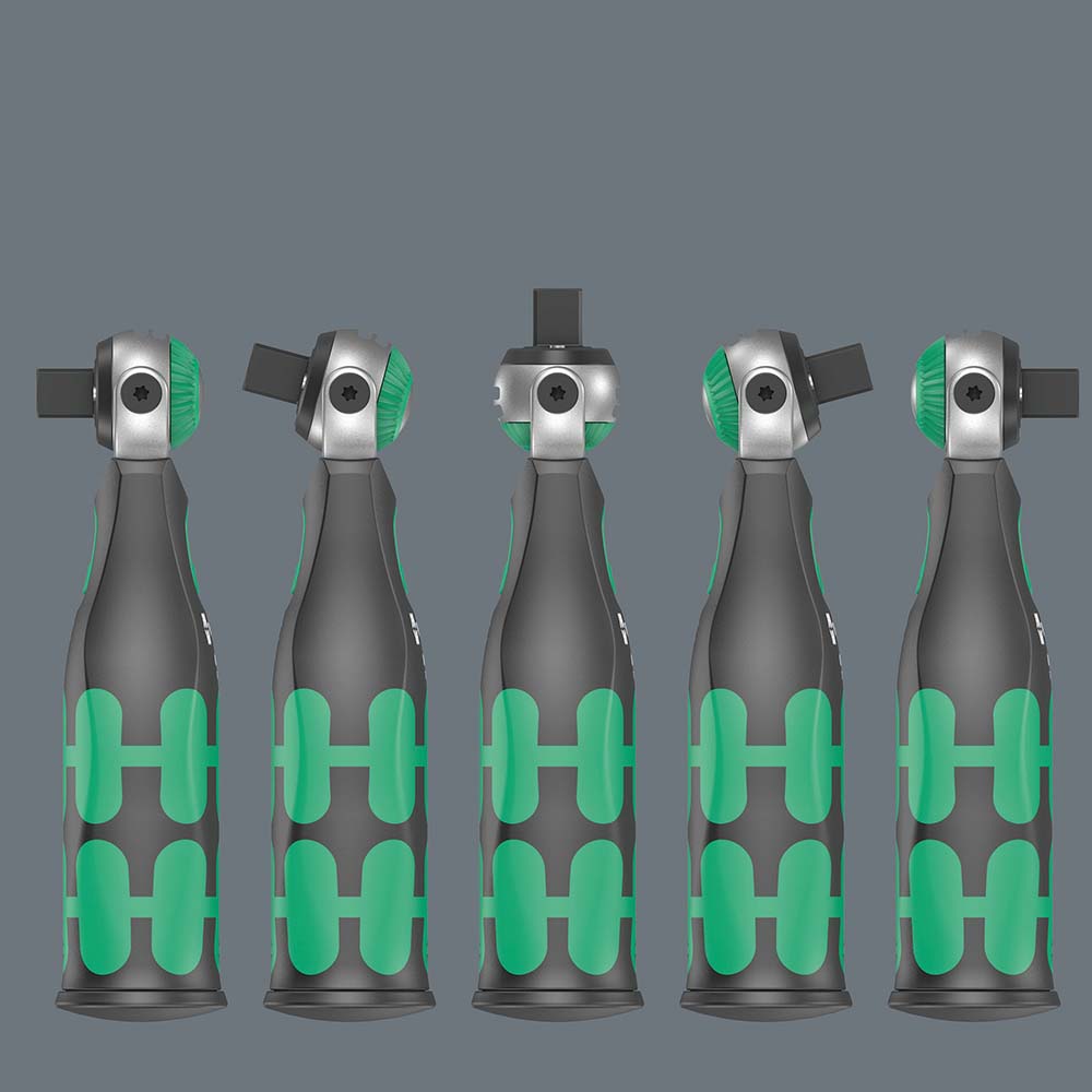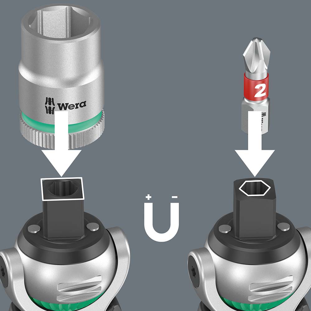 Ratchet head doubles up as both a 3/8″ square drive ratchet for sockets, and integral 1/4″ hexagon drive for screwdriver bits