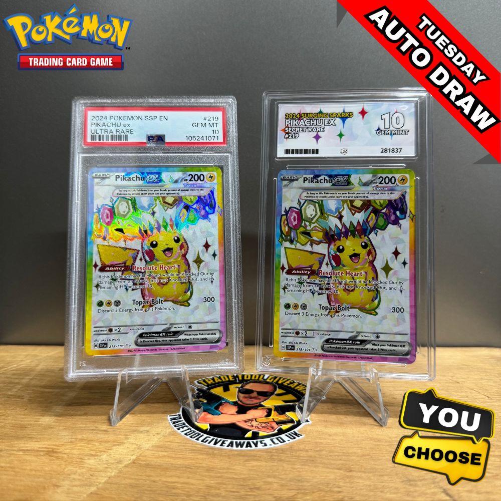 Auto Draw – Pokémon Surging Sparks Pikachu Ex 219/191 – PSA or ACE 10