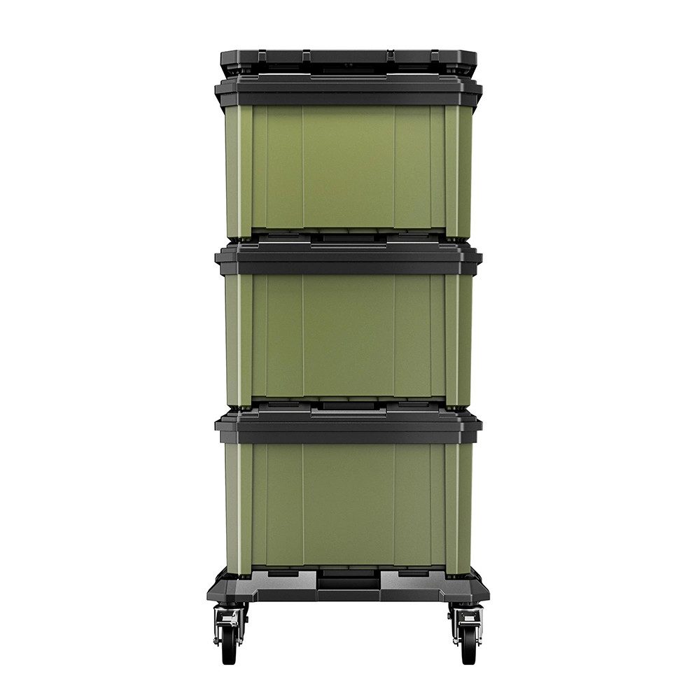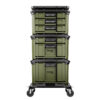 Constructed from high-impact resistant polypropylene, the drawer units are engineered to withstand demanding environments, daily use and frequent movement. The fast and reliable interlocking design ensures each component connects securely, creating a strong, stable stack that can be confidently moved around your workspace or jobsite. The included dolly transforms the entire system into a mobile storage station, making it easy to reposition heavy tools and equipment without lifting individual boxes.