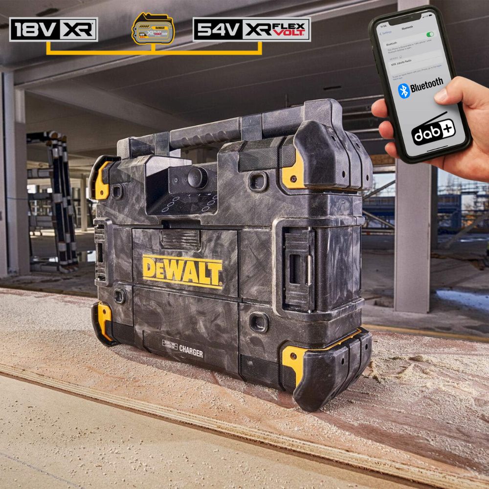 For superior versatility, the TSTAK Connect Radio can be powered by either mains power or by DEWALT battery packs (10.8V, 12V, 18V XR and 54V XR FLEXVOLT), which charge themselves when the radio is connected to the mains.