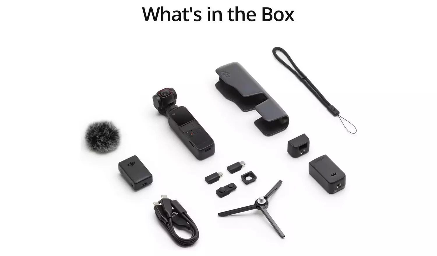 The creator combo includes DJI USB Splitter Charging Cable (Type-A to Type-C), Osmo Pocket Smartphone Adapter (Lightning & USB-C), DJI Pocket 2 Do-It-All Handle, DJI Wireless Microphone Transmitter + DJI Wireless Microphone Windscreen, DJI Pocket 2 Micro Tripod and DJI Pocket 2 Wide-Angle Lens.