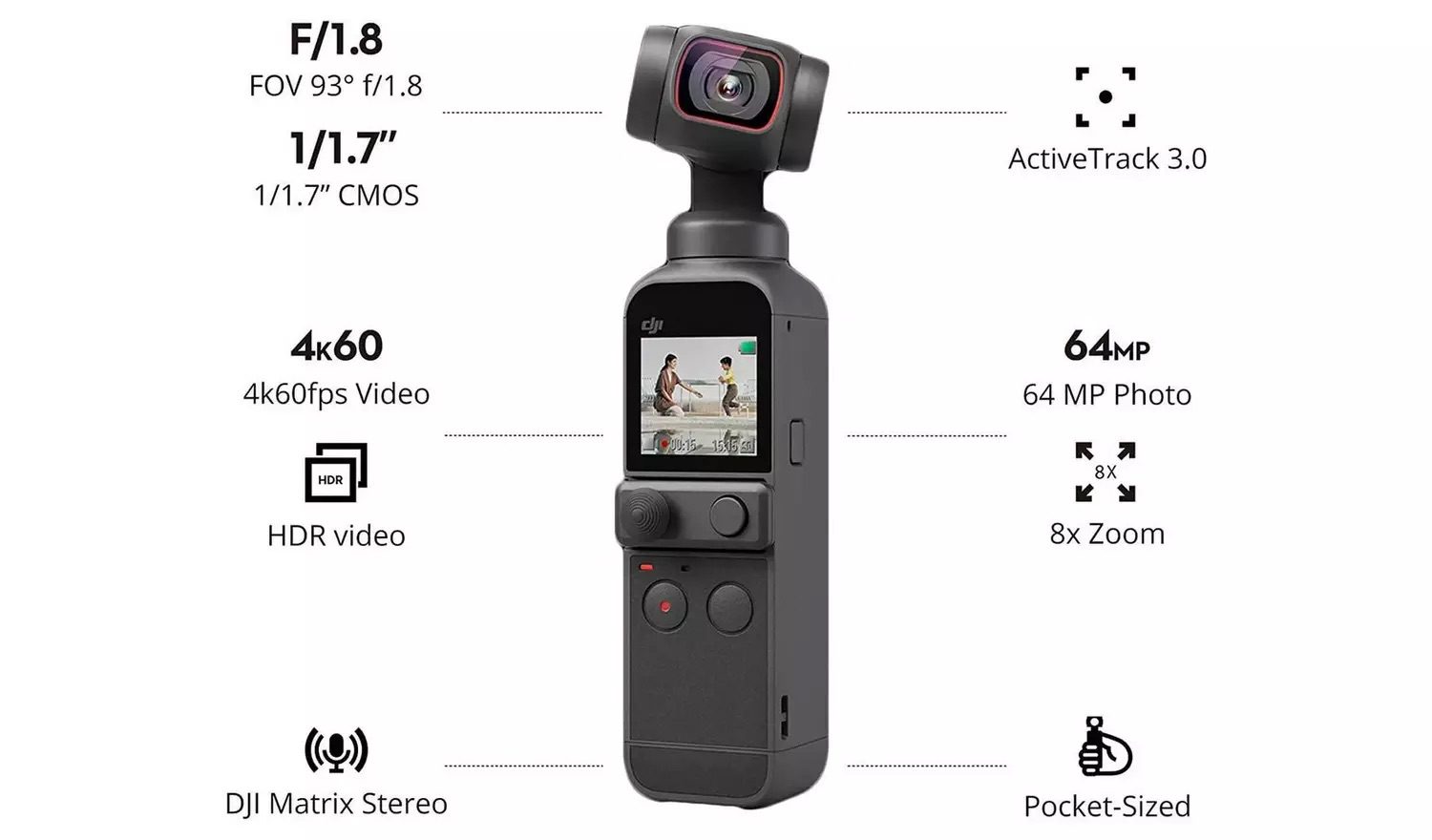 DJI Pocket 2 is a handheld gimbal camera that combines mobility and stability in one device. It shoots sharp 64 MP photos and stable video at up to 4K 60fps. The onboard touchscreen displays a live view from the camera, can control camera and gimbal movements. Create the perfect shot with intelligent modes such as ActiceTrack, Zoom, Panorama, Timelapse and HDR Video. Enjoy high quality sound recording with four microphones that boast wind noise reduction.