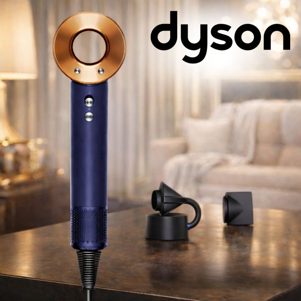 Dyson Supersonic hair dryer – Straight + Wavy (Prussian blue/Rich copper) Dyson’s debut hair dryer for straight and wavy hair. Fast drying. With no extreme heat. Intelligent heat control helps protect your hair’s natural shine. Powered by a powerful digital motor, spinning at up to 110,000 rpm. With Air Multiplier technology, produce a high-pressure jet of controlled air for fast drying and precision styling.