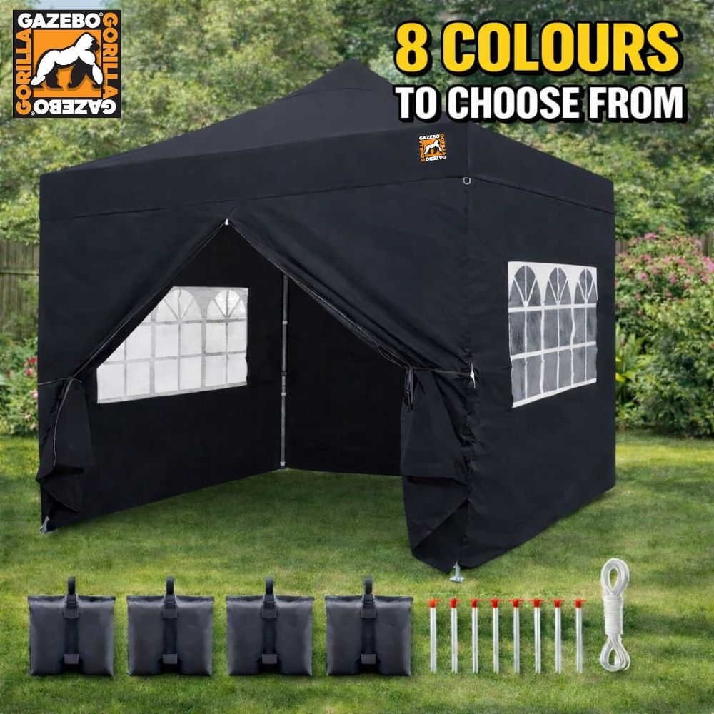 Gorilla Gazebo 3m x 3m Pop-Up Gazebo with Four Sides, Leg Weights, Wheeled Carrybag, Peg and Guy Ropes