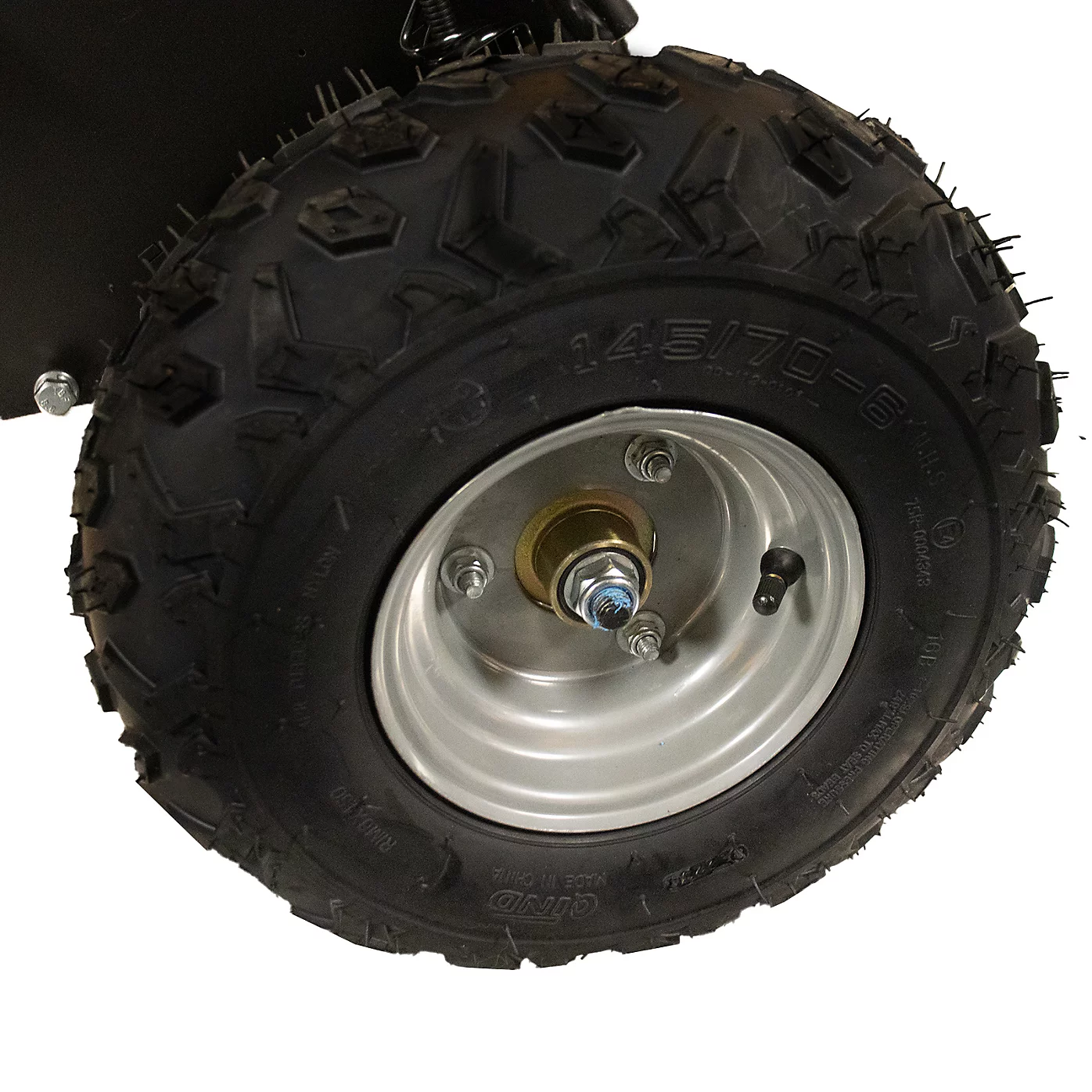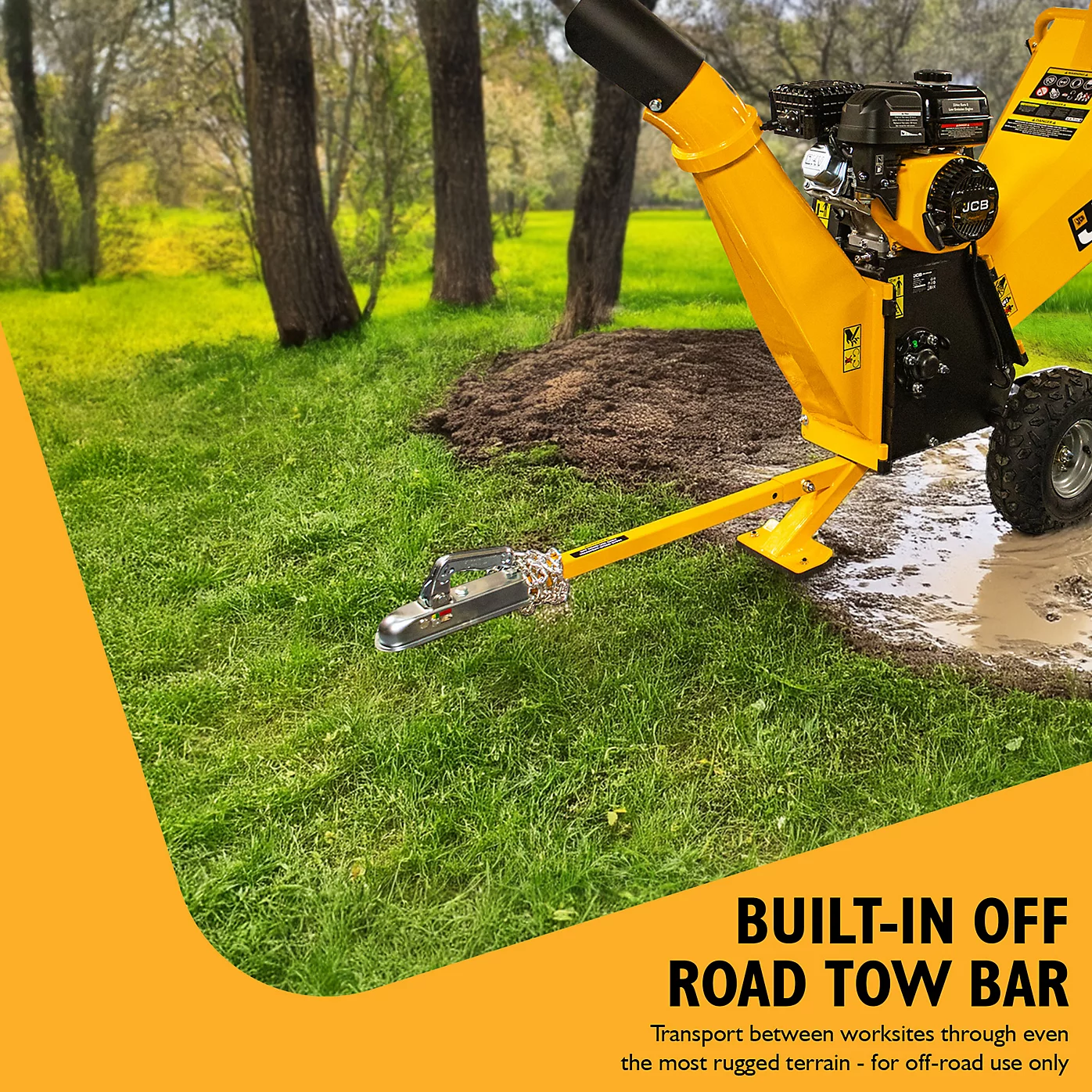 Our JCB-CH75100P petrol wood chipper is built with high quality robust materials to cope with chipping of logs up to 100 mm / 4” in diameter. With an ATV tow mount, this is ideal for anyone managing woodland or shrub on estates, farms, construction sites, roadways, pathways or general large garden tidy up. (Note, this is not road towable). Powered with a market-leading 7.5hp 4 stroke JCB petrol Engine with easy recoil-start, and designed with a 360° rotating outlet chute and guide, it’s ideal to use when chipping wood into trailers, for compost, mulch or simply mulching the chippings prior to transportation. The heavy duty 14.5 Inch pneumatic wheels make it easy to transport on uneven ground or fields and the twin reversible blades can rapidly chip cumbersome pieces of wood ready to be used for the chosen application.