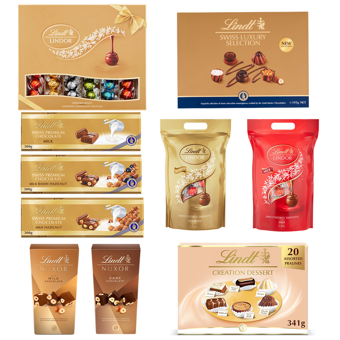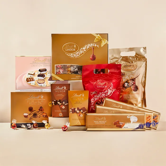 Discover our smooth Milk, fruity Raisin & Hazelnut and crunchy Hazelnut giant Gold chocolate bars, boxes of our nutty NUXOR Milk and Dark chocolate cubes, a blissful LINDOR Gift Box (plus 1kg bags of our iconic Milk Chocolate and Assorted LINDOR truffles), an exquisite SWISS LUXURY SELECTION chocolate box filled with our Master Chocolatiers’ indulgent pralines, and a luxury CREATION chocolate box filled with our delicious dessert-inspired chocolate.