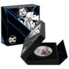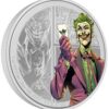 The design showcases a detailed portrait of the Joker in full colour, with his signature grin and green hair. The background features a comic book style image of the Joker. The obverse side of the coin features the effigy of Queen Elizabeth II, along with the year of issue, face value, and the weight and purity of the silver.