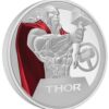 This collectible 2023 1oz silver coin features Marvel’s Thor, holding Mjolnir his enchanted war-hammer, with his cloak painted red flowing behind him. The background is minted to a mirror finish adding extra impact and making this a very desirable coin. The obverse displays the Public Seal of Niue, confirming the coin’s legal tender status.