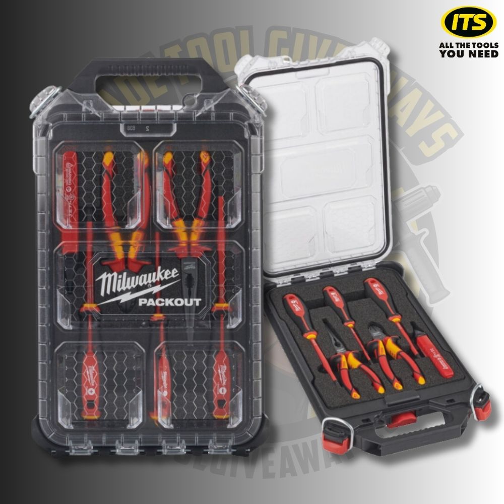 The Milwaukee 7 Piece PACKOUT Electricians Set is a selection of VDE hand-tools along with a Voltage meter neatly packed in a PACKOUT Organiser Slim Compact case.