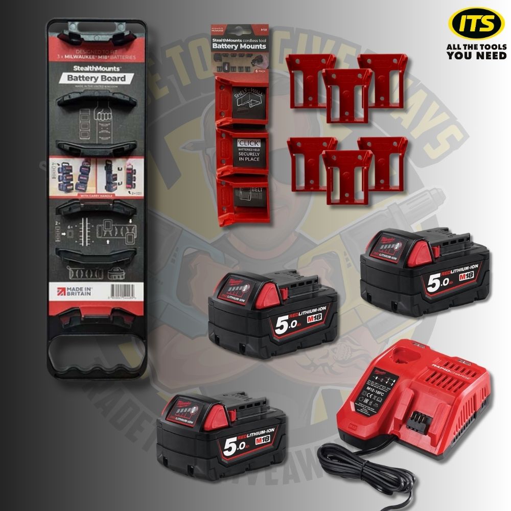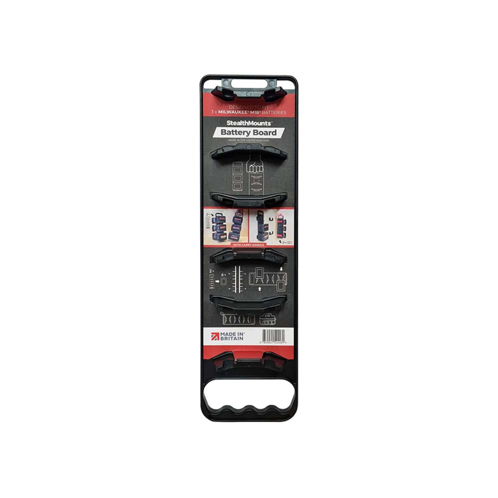 The StealthMounts BLACK Battery Board for Milwaukee M18 Batteries with Handle from ITS is the perfect transporting solution when you need to carry multiple Dewalt Batteries.