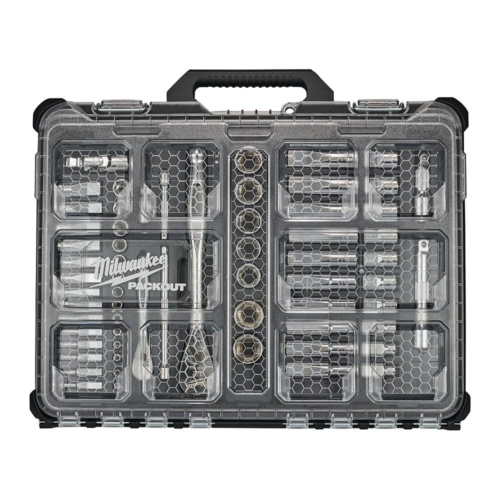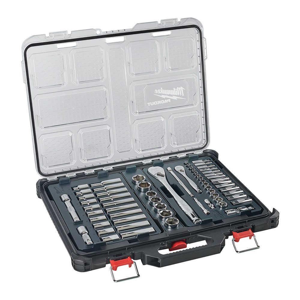 The Milwaukee 63 Piece 1/4” & 1/2” Ratchet & Socket Set in PACKOUT Case is a massive, detailed as well as versatile selection of sockets, ratchet handle, extension handles and more, all neatly stored away in a PACKOUT Case.
