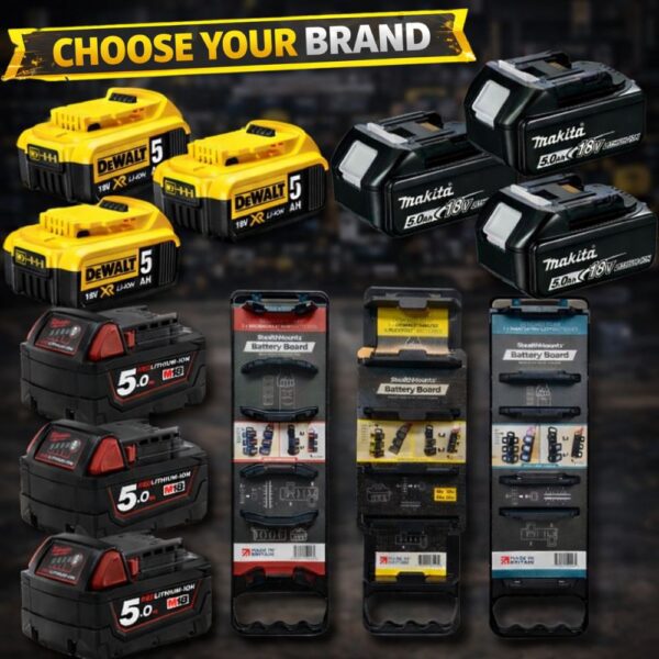 Interior features 5 removable & mountable bins that can be mounted onto common jobsite materials for easy access.
