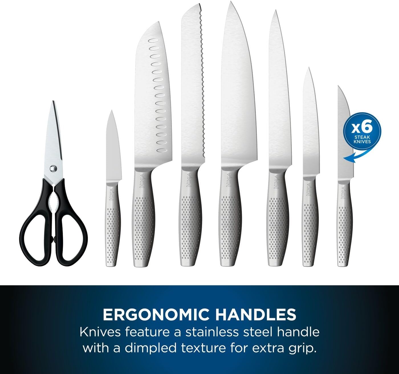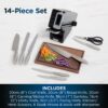 This premium 14-piece knife set includes an 8” Chef Knife, 8” Bread Knife, 8” Slicing Knife, 7” Santoku Knife, 6” Utility Knife, 3.5” Paring Knife, 6 x 4.5” Steak Knives, and Scissors – so you can prepare anything to perfection.