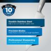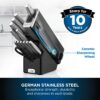 Forged from German stainless steel, famed for its strength and durability, these premium knives feature a full tang design: each blade is created from a single piece of steel, with the tang extending the entire length of the handle for optimal durability, strength, and stability.