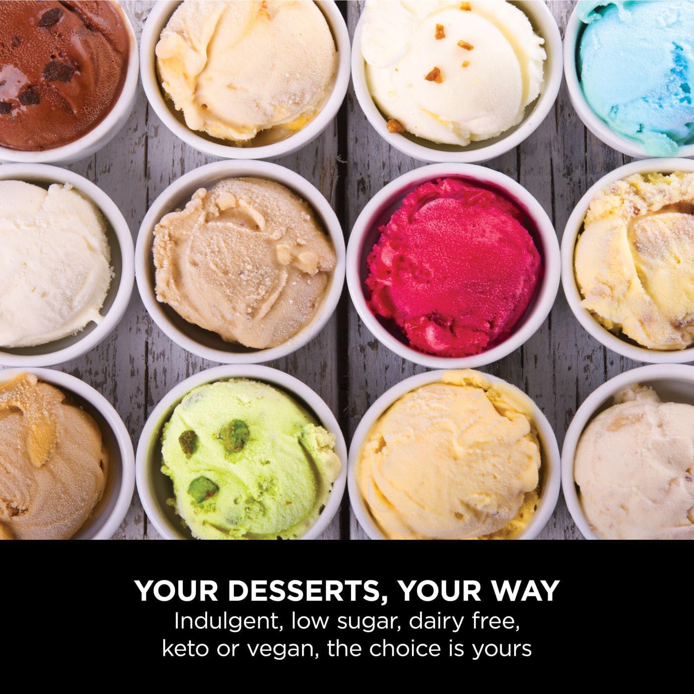 10 one-touch programs – Ice Cream, Sorbet, Light Ice Cream, Gelato, Milkshake & Mix-In, plus New Modes: Frappe, Frozen Drink, Slushi & Frozen Yoghurt.