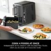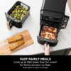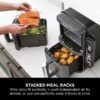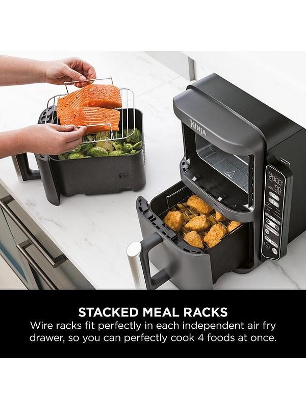 2x capacity** with Double Stack Air Fry Technology: Cook on 4 levels at once for evenly crispy results. Simply insert the included Double Stack meal racks into each drawer to double your cooking surface. Even cooking and crisping on 4 levels: each drawer has an individual heat source and rear fan, delivering 360° air circulation for all-over crispy results. Layer your food on the racks for multi-level cooking – perfect for making chicken thighs with asparagus, salmon fillets with new potatoes, beef burgers with French fries, or a selection of party food.