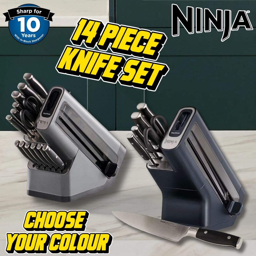 Introducing a deluxe edition of our Ninja Foodi StaySharp Knife System – now in a 14-piece set featuring 12 essential kitchen knives, a dedicated knife block with handy built-in sharpener and a pair of kitchen scissors, built to last from forged German stainless steel with precision blades.