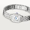 Panthère de Cartier watch, mini model, quartz movement. Steel case and bracelet. Octagonal crown set with a blue synthetic spinel. Silvered dial, blued-steel sword-shaped hands, sapphire crystal. Dimensions: 25 mm x 19 mm, thickness: 6 mm. Water-resistant to 3 bar (approx. 30 metres).