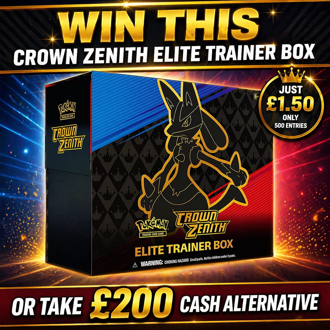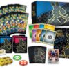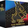 The Pokémon TCG: Crown Zenith Elite Trainer Box includes 10 Pokémon TCG: Crown Zenith booster packs, 1 etched foil promo card featuring Lucario VSTAR, 65 card sleeves featuring Lucario, 45 Pokémon TCG Energy cards, a player’s guide to the Crown Zenith expansion, 6 damage-counter dice, 1 competition-legal coin-flip die, 2 acrylic condition markers, and 1 acrylic VSTAR marker.