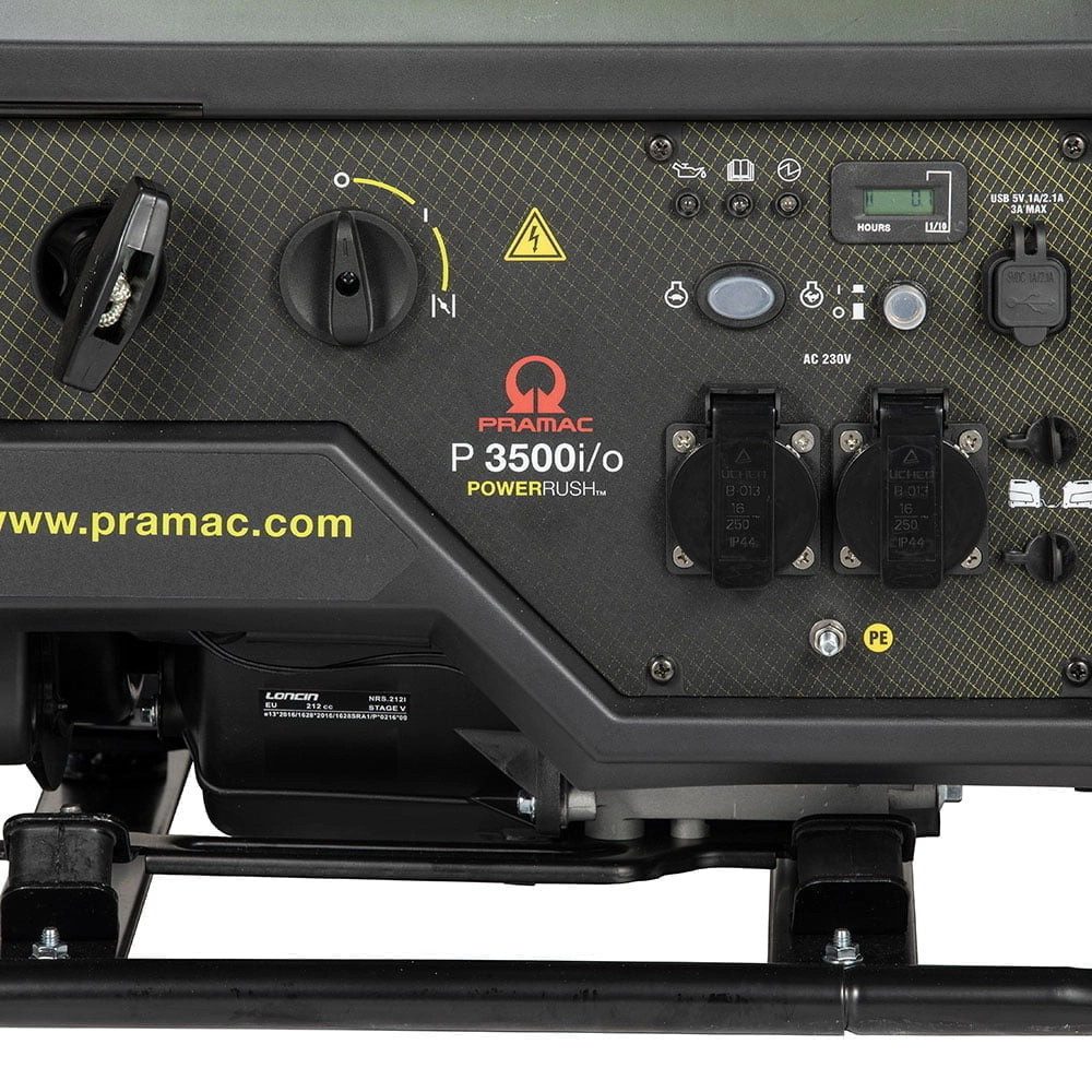 Thanks to its lightweight, open-frame design and integrated carry handles, the P3500iO is easy to move and transport. The control panel includes multiple 230V outlets, a 12V DC socket, and USB ports for convenient power options. With its parallel connectivity feature, you can link two compatible Pramac inverter generators together to double your output when you need more power.