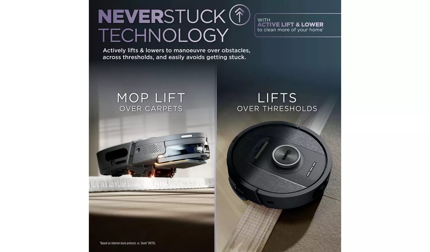 NeverStuck Technology: Actively lifts and lowers to manoeuvre over obstacles, across thresholds, and easily avoid getting stuck. In Mopping Mode it also lifts up to keep the wet mop pad off your carpets and rugs.