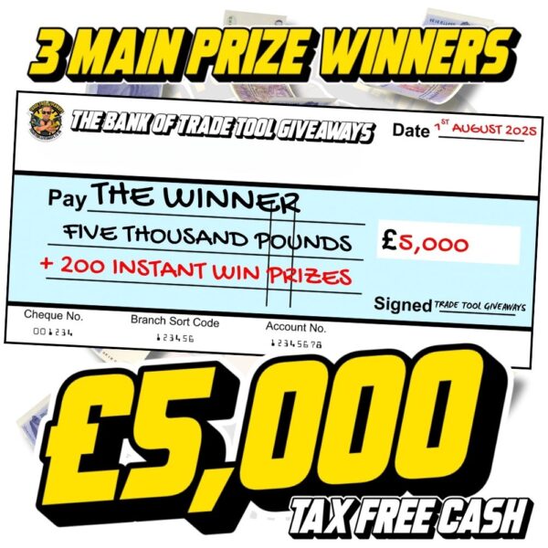This competition is open to UK residents aged 18 or over. You may enter this competition up to 400 times. You will be randomly allocated ticket number(s) when ordering and will receive an email confirmation. The total amount of tickets for this competition is (4000). If all tickets do not sell out, the draw will happen on July 4, 2025 regardless. You must answer the competition question correctly to be entered into the live draw. Incorrect entries will not be notified or entered into the live draw. You may enter the competition online, or for free by post by sending your entry to Trade Tool Giveaways on a postcard. You must have an account on Trade Tool Giveaways for your entry to be processed. All details on your entry MUST correspond to the details on your account to receive the order confirmation and ticket number. Postal entries received without a registered account cannot be processed. The live draw will take place on Trade Tool Giveaways Facebook page using Google’s random number generator to select the winning ticket number from all Entrants. This competition is in no way sponsored, endorsed, administered by or associated with Facebook, Apple or Google. By entering the competitions, Entrants agree that neither Facebook, Apple nor Google have any liability and are not responsible for the administration or promotion of this competition.