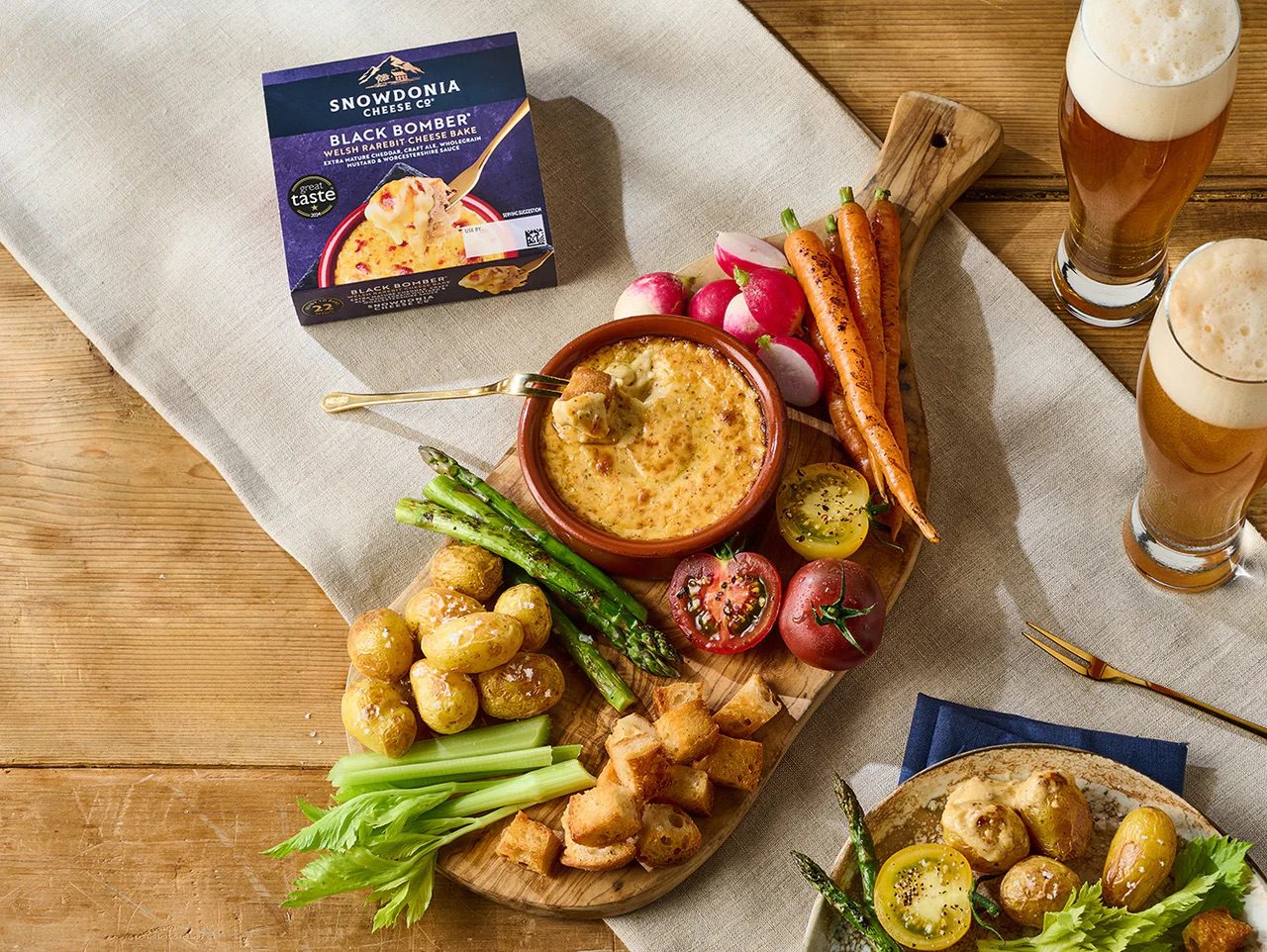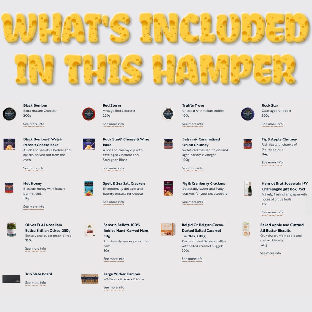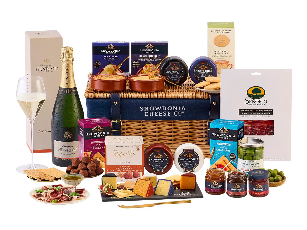 Tucked alongside them in this wonderful bundle you’ll discover the rich and velvety delights of our Black Bomber Welsh Rarebit and Rock Star Cheese & Wine cheese bakes; a trio of traditionally made chutneys – Caramelised Balsamic Onion; Fig & Apple; and Hot Honey – and boxes of Fig & Cranberry and Spelt & Sea Salt crackers. The lucky recipient will also be treated to a handpicked selection of sweet and savoury bites – from 100% Iberico hand-carved ham and Sicilian olives to Belgian chocolates and baked apple and custard biscuits – plus a full-sized bottle of Henriot Brut Souverain NV champagne.
