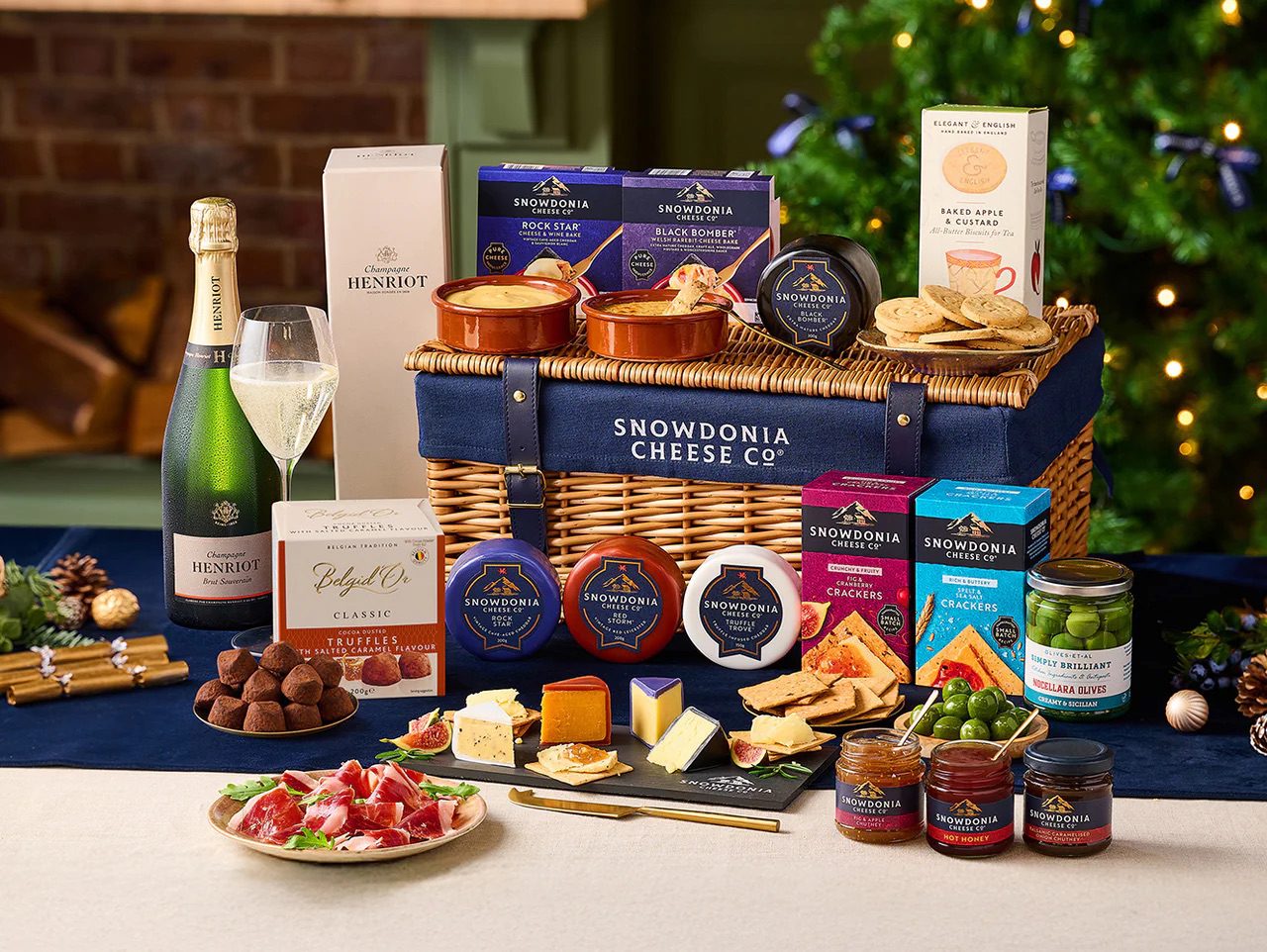 Luxurious feast this Christmas with this truly decadent wicker hamper, filled with Snowdonia Cheese Co favourites and indulgent gourmet pleasures from our guest producers. Presented with a stylish slate serving board are four award-winning Snowdonia cheeses – Black Bomber extra mature Cheddar; Red Storm vintage Red Leicester; Truffle Trove, our extra mature Cheddar infused with Black Summer truffle; and Rock Star, our vintage Cheddar aged in Welsh slate caverns.