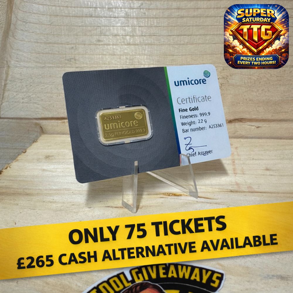 A brand-new 2.5 gram fine gold bar, supplied by LBMA-approved refiner Umicore.