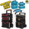 Storage system that protects tools from the toughest of site and weather conditions. Polypropylene construction with a visible IP65 water and dust seal. Features easy-to-use, time-saving latches for connecting modules together and a buckled lid with lockable plastic clamps. Supplied with an extendable / detachable handle and wheels for convenient transportation. Compatible with ToughSystem.